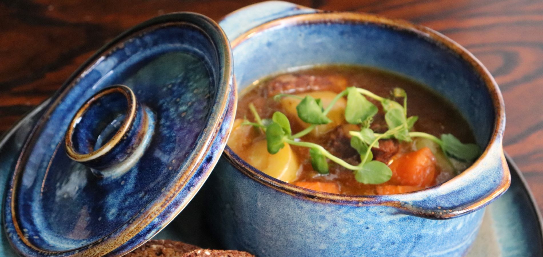 Hartige seizoensstoofpot geserveerd met zelfgebakken bruinbrood en Ierse romige boter.